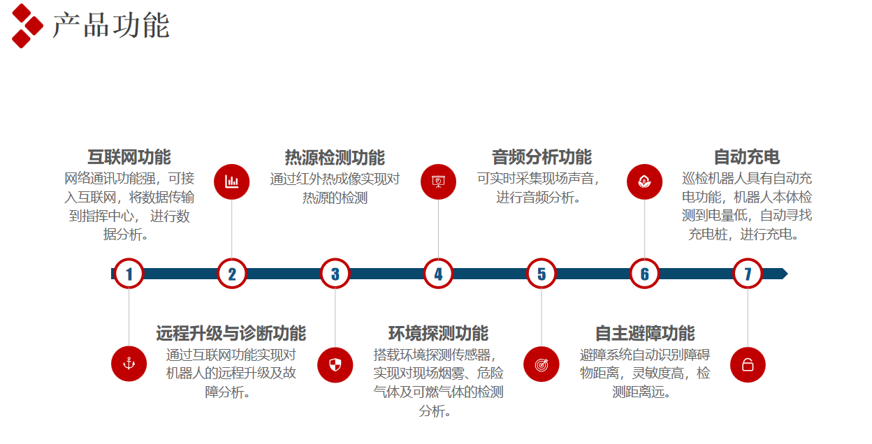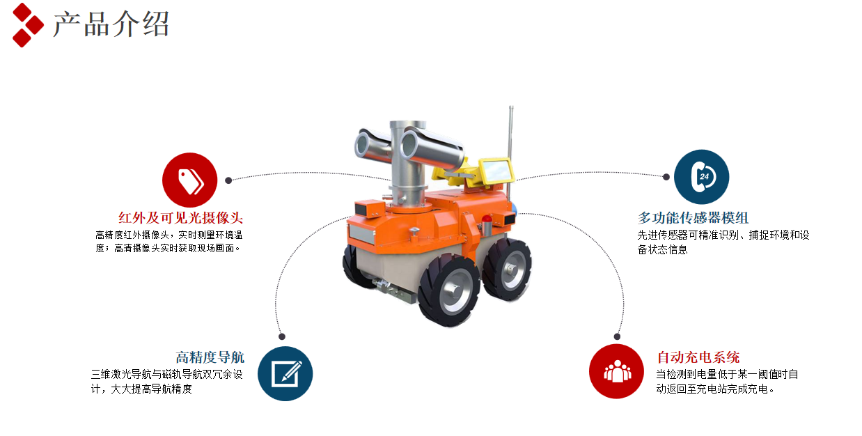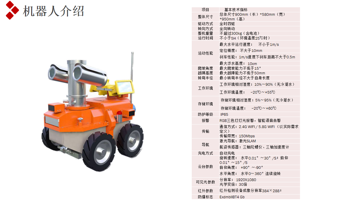 YR601 防爆巡检机器人具有全身防爆设计,可进行全场景巡逻,具备气体激光遥测、可见光以及红外热成像、气体探测传感器挂载等功能。自动驾驶结合先进的组合式导航包括视觉辅助、激光导航等。可在室内外各种恶劣环境下对仪表、液位计、阀门等现场设备的跑冒滴漏及其他异常状态进行分析报警。另外在电量不足时,可自动返回、自主充电。特别在易燃易爆危险品生产、仓储环节中可游刃有余替代人工进行巡检,不仅节省了人力成本,还保障了人员及设备安全。